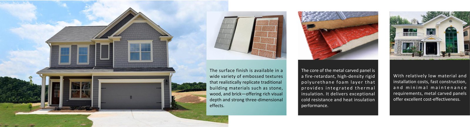 金属雕花板表面是经特殊图层处理过的彩色浮雕饰面金属板,中间层是经阻燃处理的硬质高密度聚氨酯发泡保温断热层, 底面是起到隔热保温防潮作用的铝箔保护层。由于墙板本身具备着保温隔热、防水阻燃、轻质抗震、施工便捷、隔音降噪、绿色环保、美观耐久等特性,同时因其板体组装方式简单实用,不受季节环境限制,因此安装使用非常安全方便。